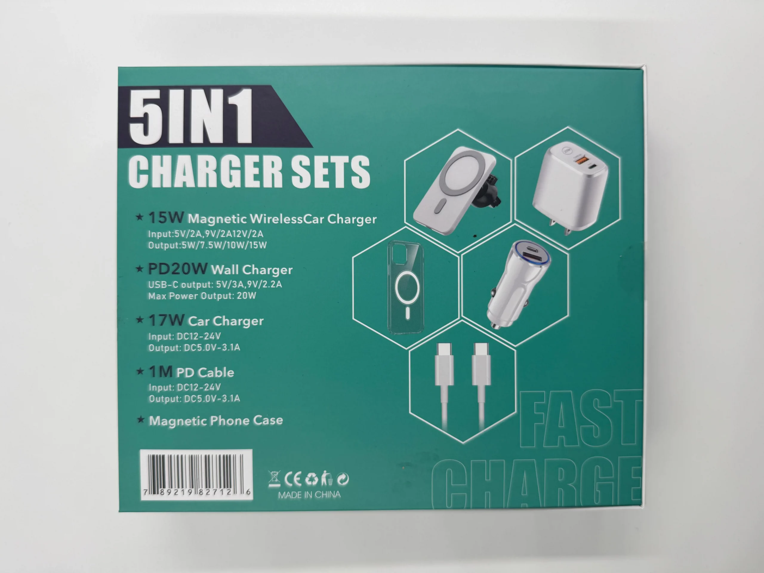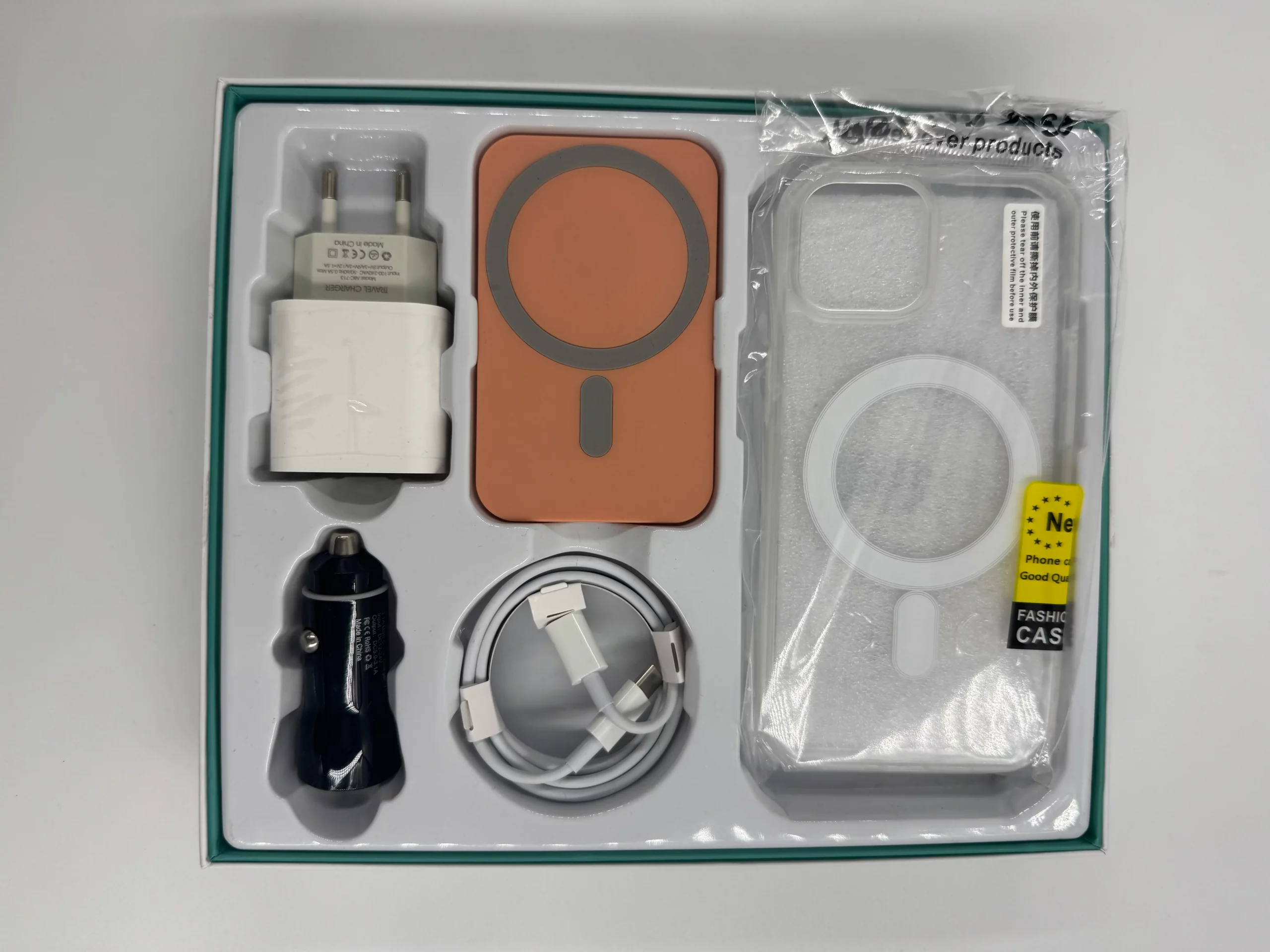 Ensemble complet de charge 5-en-1 MagSafe présenté dans son emballage d’origine.Coffret de charge sans fil 5-en-1 MagSafe – Chargeur voiture, adaptateur secteur, câble PD et coque magnétique