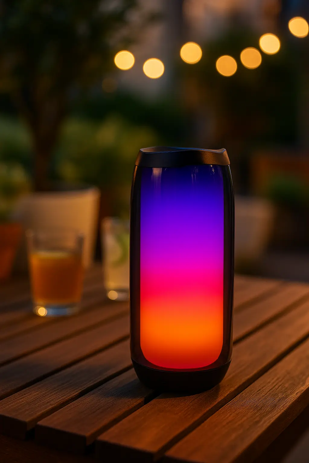 Enceinte Bluetooth PLUSE4 posée sur une belle table illustrant les options de couleurs LED.Enceinte Bluetooth PLUSE4 – Son 360° & Lumières LED RGB – Puissante, Sans Fil et Rechargeable