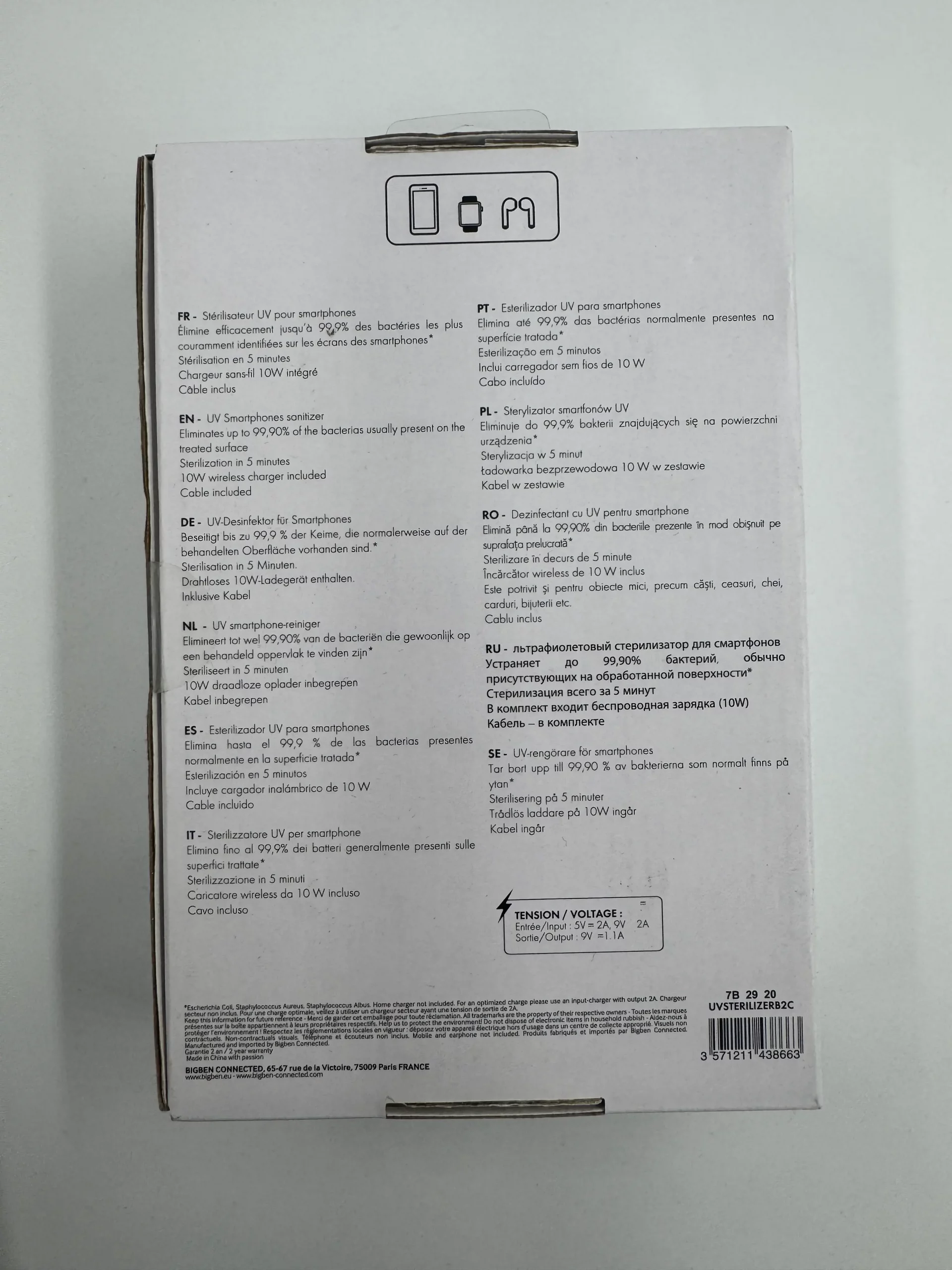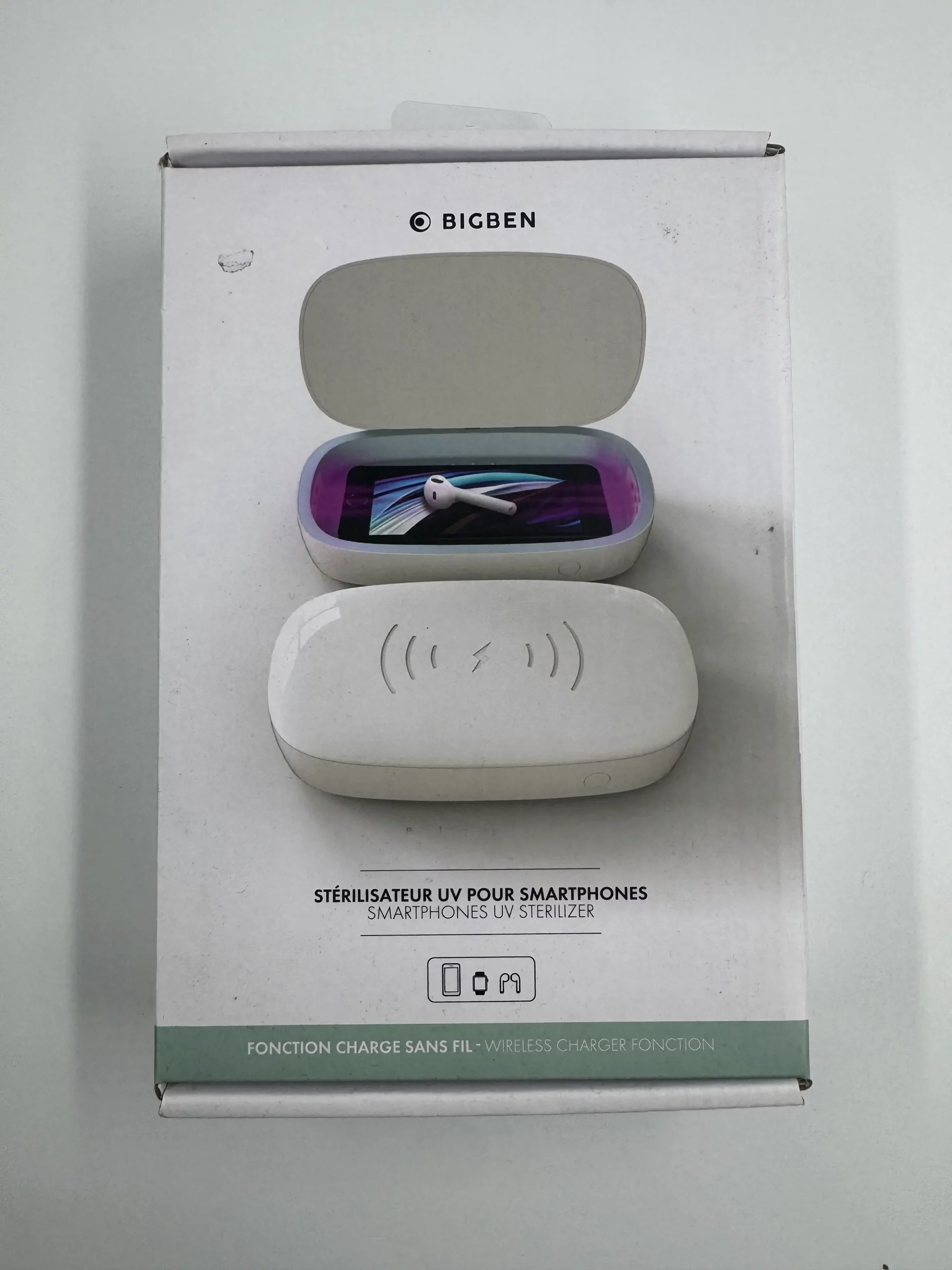 Le stérilisateur UV Bigben utilise une lumière ultraviolette spécialement calibrée pour éliminer jusqu’à 99,9 % des bactéries et germes présents sur les surfaces de ton smartphone, écouteurs, montres connectées ou bijoux.